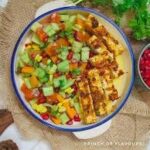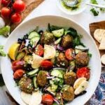 Lettuce, Tomato, Onion, Cucumbers, Salad dressing and Pita croutons.